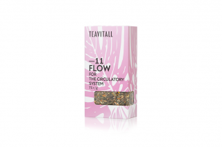 Компоненты чайного напитка Flow способствуют, снижению риска образования тромбов, профилактике болезней сердца и сосудов. Растительные компоненты помогают в укреплении кровеносных сосудов, делая их более эластичными, улучшают кровоснабжение всех тканей организма. Донник придает чаю приятный травяной вкус, а имбирь и корица — пряный восточный аромат.